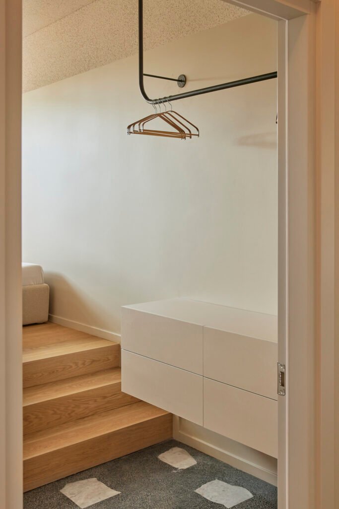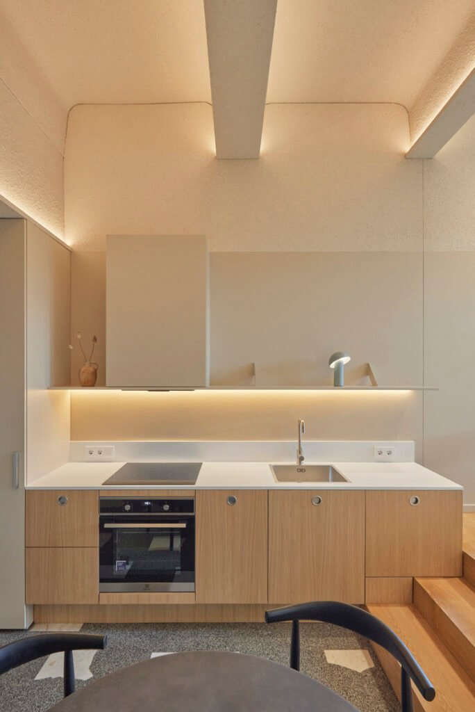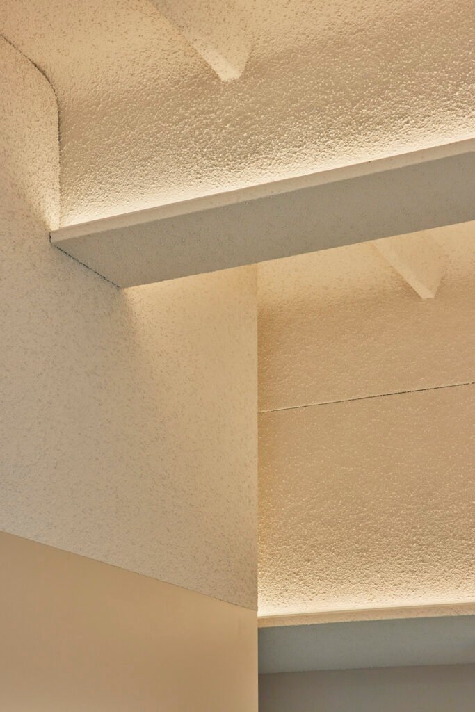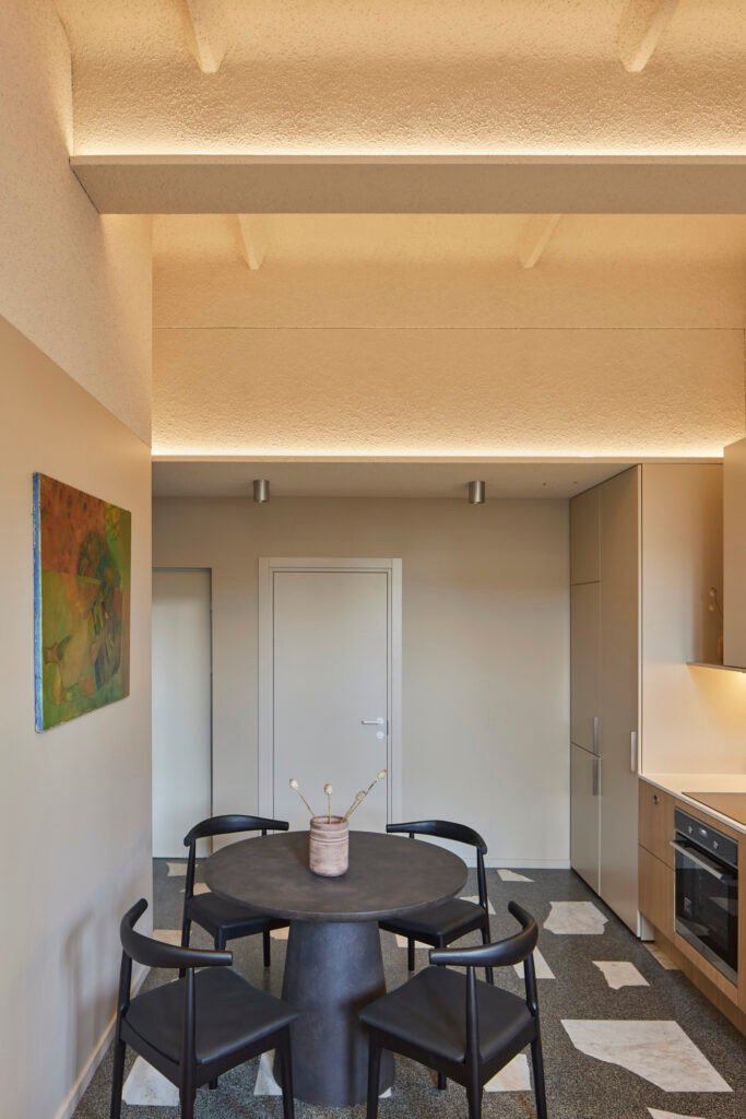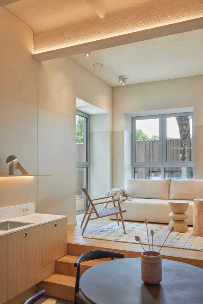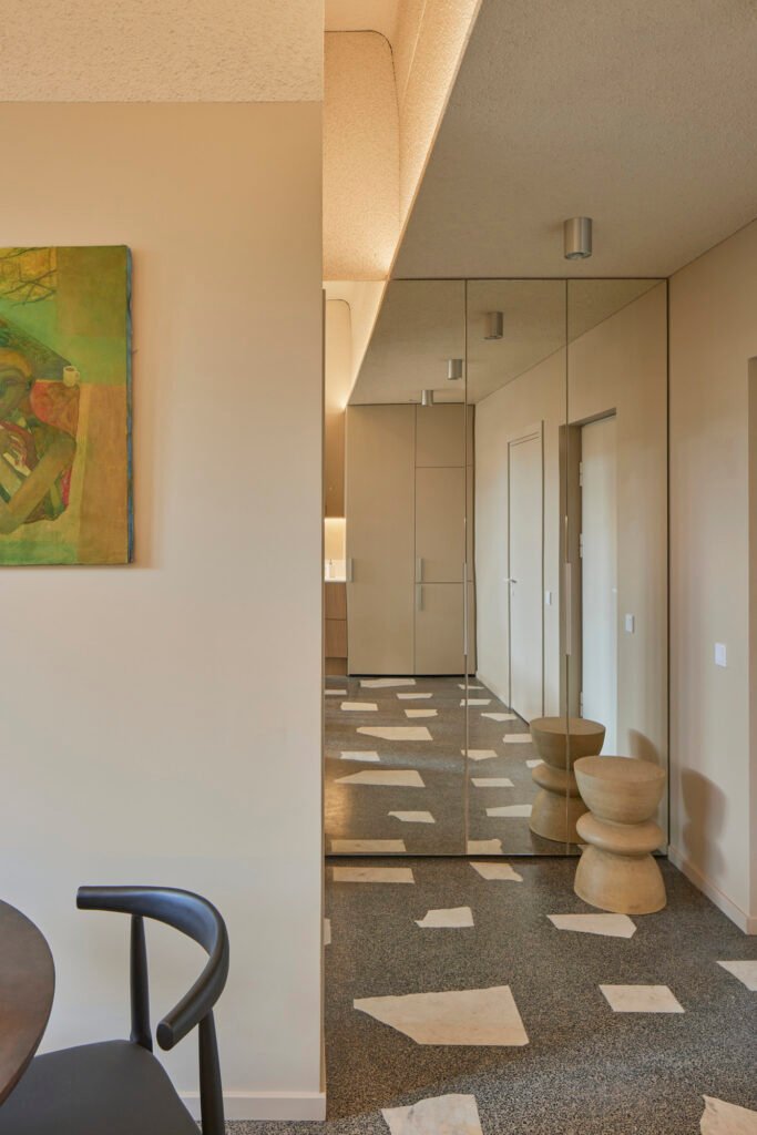 Druskininkų širdyje, unikaliame buvusiame restorano pastate, kurio architektūrą atnaujino KAParchitects projektavome ir vidaus apartamentų interjerą. Padėjome įsikūrti 5 apartamentams. Esama laiptuota pastato erdvė įtakojo nestandartinius apartamentų sprendimus. Dalis patalpų su peraukštėjimais tiek grindyse tiek lubose. Taip sukuriant labai efektingą erdvės judėjimą. Į grindis įlietos buvusio restorano marmuro apdailos plokštės. Įspudingai atrodančios esamos lubų konstrukcijos padengtos stambios frakcijos tinku, tačiau išlaikant lubų liniją, nuo jos visa apatinė sienų dalis yra dažyta lygiai. Taip papildomai suvaldoma erdvė.