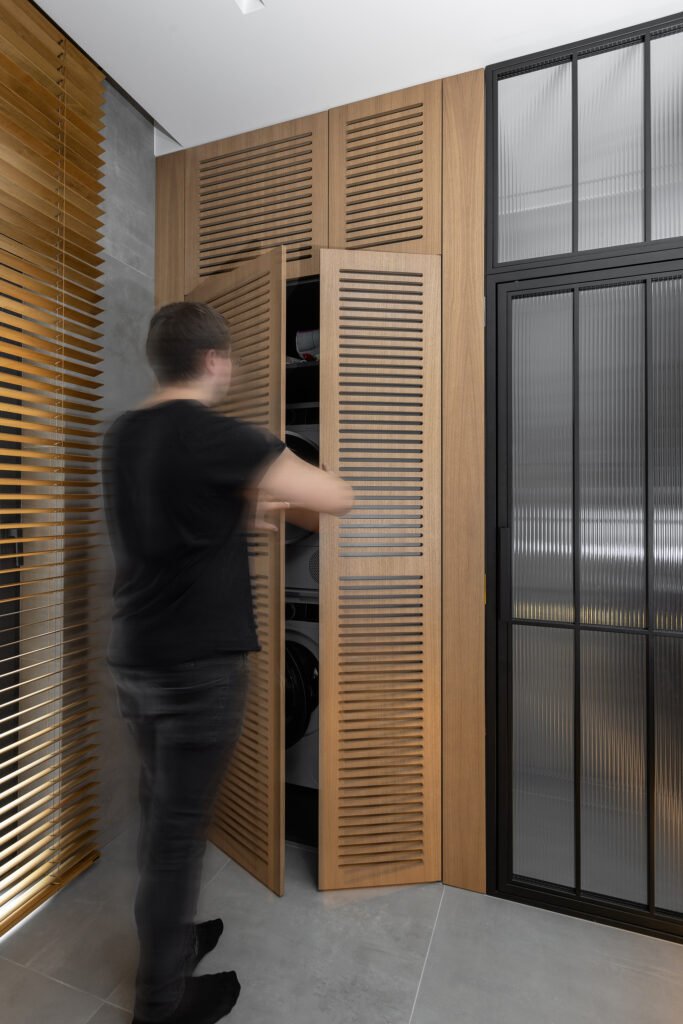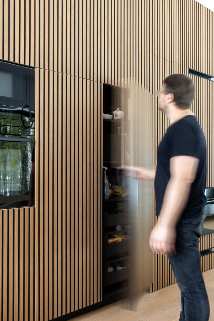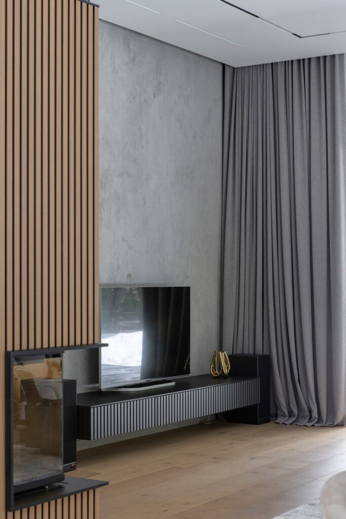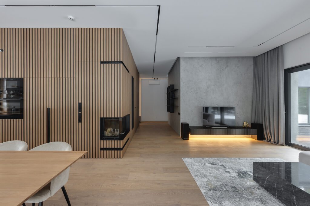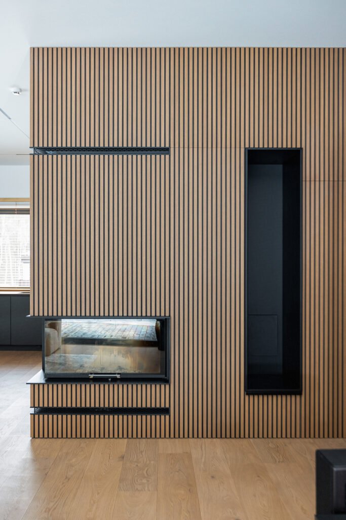 Individualaus namo interjeras, miško apsuptyje, Milošo g. Vilniuje. Projektuotas 4 asmenų šeimai. Frezuoti, skirtingų medžiagų atsikartojantys sprendimai erdvėse, atliepia ne tik vizualius bet ir paslėptus funkcinius sprendimus. Naudojamos medžiagos sukuria harmoningą modernios estetikos ir natūralios šilumos derinį.